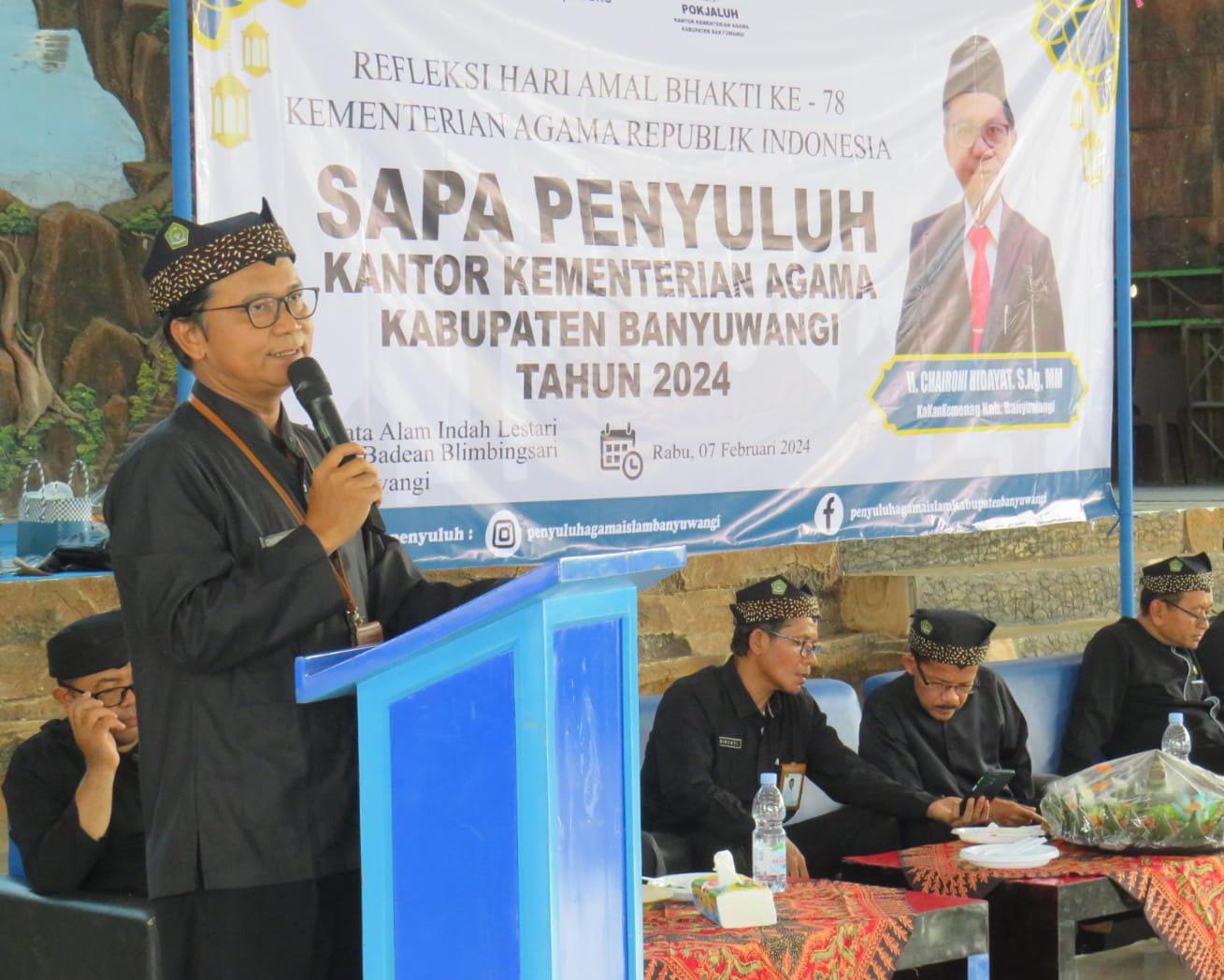 Suara Pecari – Dalam upaya meningkatkan semangat dan kualitas pelayanan, Kepala Kantor Kementerian Agama Kabupaten Banyuwangi, Chaironi Hidayat, memberikan penyuluhan kepada 201 penyuluh Agama Islam (PNS/PPPK/Non PNS) di Agrowisata Alam Indah Lestari, Kecamatan Blimbingsari, pada Rabu (07/02/2024).