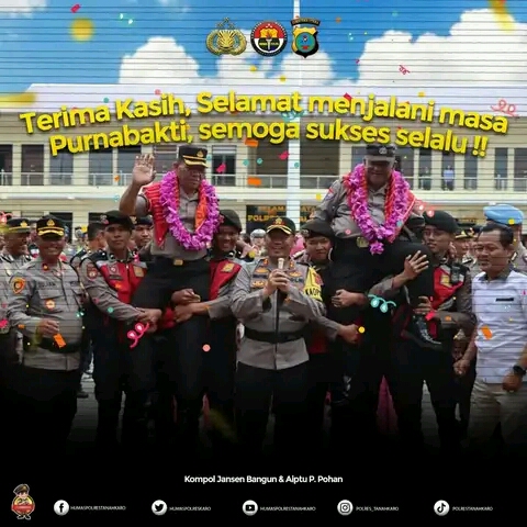 “Hari ini merupakan hari yang sangat istimewa khususnya bagi para senior kita yang telah berhasil melewati perjalanan pengabdian yang panjang dan penuh kesetiaan mengabdikan diri kepada masyarakat, bangsa dan negara melalui Kepolisian Negara Republik Indonesia hingga memasuki masa purna bakti”, kata Kapolres.