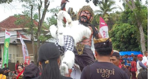 Belasan pemuda dengan semangat membopong ogoh-ogoh raksasa melibatkan tokoh-tokoh dari anime, sosok dewa, hingga raksasa barong. Yang membedakan pawai ogoh-ogoh tahun ini adalah kehadiran ogoh-ogoh raksasa yang menggambarkan sosok koruptor, sebuah simbol dari sifat buruk manusia yang dianggap perlu dihanguskan.