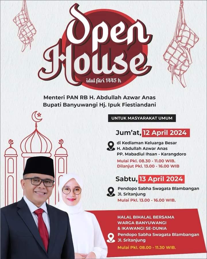 “Open House Idul Fitri 1445 H. Halal Bihalal bersama warga Banyuwangi dan Ikawangi se-dunia” tertulis pada pamflet yang tersebar di masyarakat.
