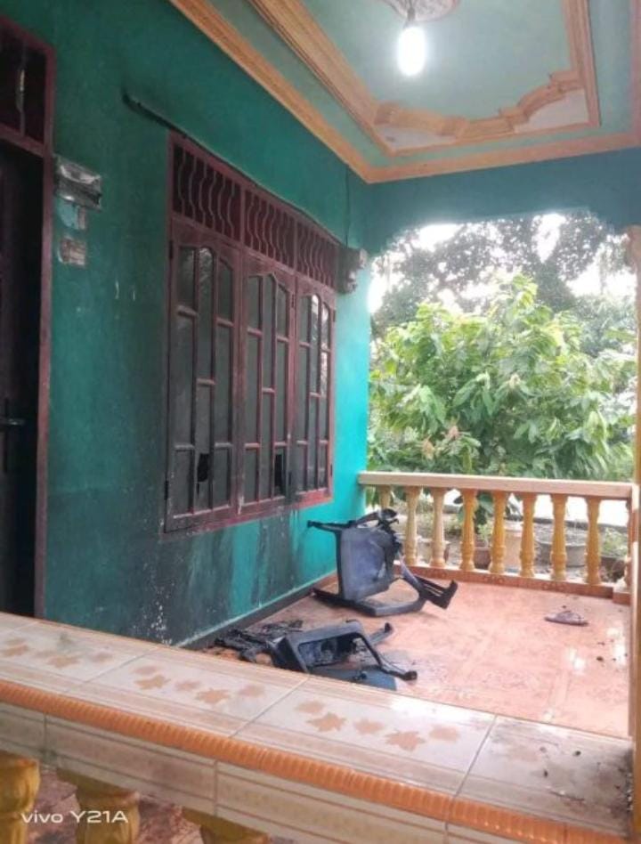 Rumah Suyanto yang terletak di Desa Pulau Tagor di bakar orang tak dikenal. Kursi kursinya yang terletak di teras rumah hangus terbakar. Api sempat menyambar meteran listrik rumahnya. Tetapi cepat cepat dipadamkan oleh keluarga, kata Suyanto. Jumat (31/5/2024) sore.