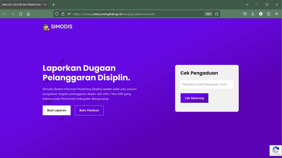 SiMoDiS Kabupaten Banyuwangi merupakan sebuah sistem informasi yang terintegrasi dengan situs resmi simpeg.banyuwangikab.go.id. Dengan aplikasi ini, proses monitoring dan pengawasan terhadap pelaksanaan hukuman disiplin terhadap ASN dapat dilakukan secara lebih efektif dan transparan. Tak hanya itu, masyarakat pun diberikan kesempatan untuk melaporkan dugaan pelanggaran disiplin yang dilakukan oleh ASN.