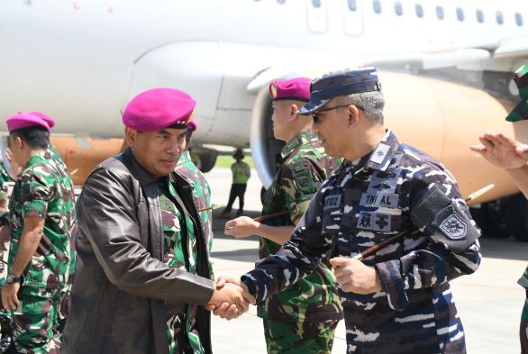 Banyuwangi — Letkol Arh Joko Sukoyo, S.Sos., M.Han., Dandim 0825/Banyuwangi, menyambut kedatangan rombongan Pangdiv 3 Kostrad Mayjen TNI Bangun Nawoko, S.I.P., dan Komandan Korps Marinir Mayor Jenderal TNI (Mar) Endi Supardi, S.E., M.M., M.Tr.Opsla., CHRMP., CRMP di Bandara Blimbingsari Banyuwangi, 30 Agustus 2024.