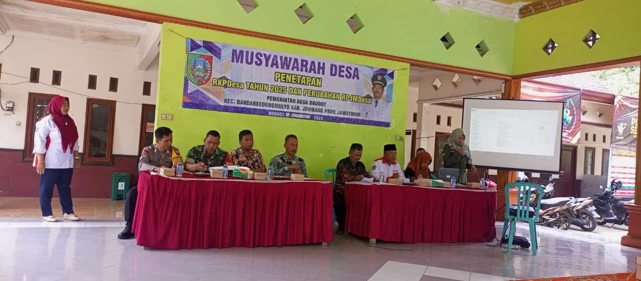 Jombang — Pemerintah Desa Brodot mengadakan Musyawarah Desa untuk menetapkan Rencana Kerja Pemerintah Desa (RKPDes) Tahun 2025 serta melakukan perubahan Rencana Pembangunan Jangka Menengah Desa (RPJMDes) pagi ini, 26 September 2024, pukul 10.00 WIB. Acara ini dihadiri oleh berbagai unsur, mulai dari Camat Bandar Kedungmulyo, Kepala Desa Brodot, Badan Permusyawaratan Desa (BPD), perangkat desa, RT/RW, tokoh masyarakat, Babinsa, Babinkamtibmas, hingga tim pendamping dan tim penyusun RKPDes.