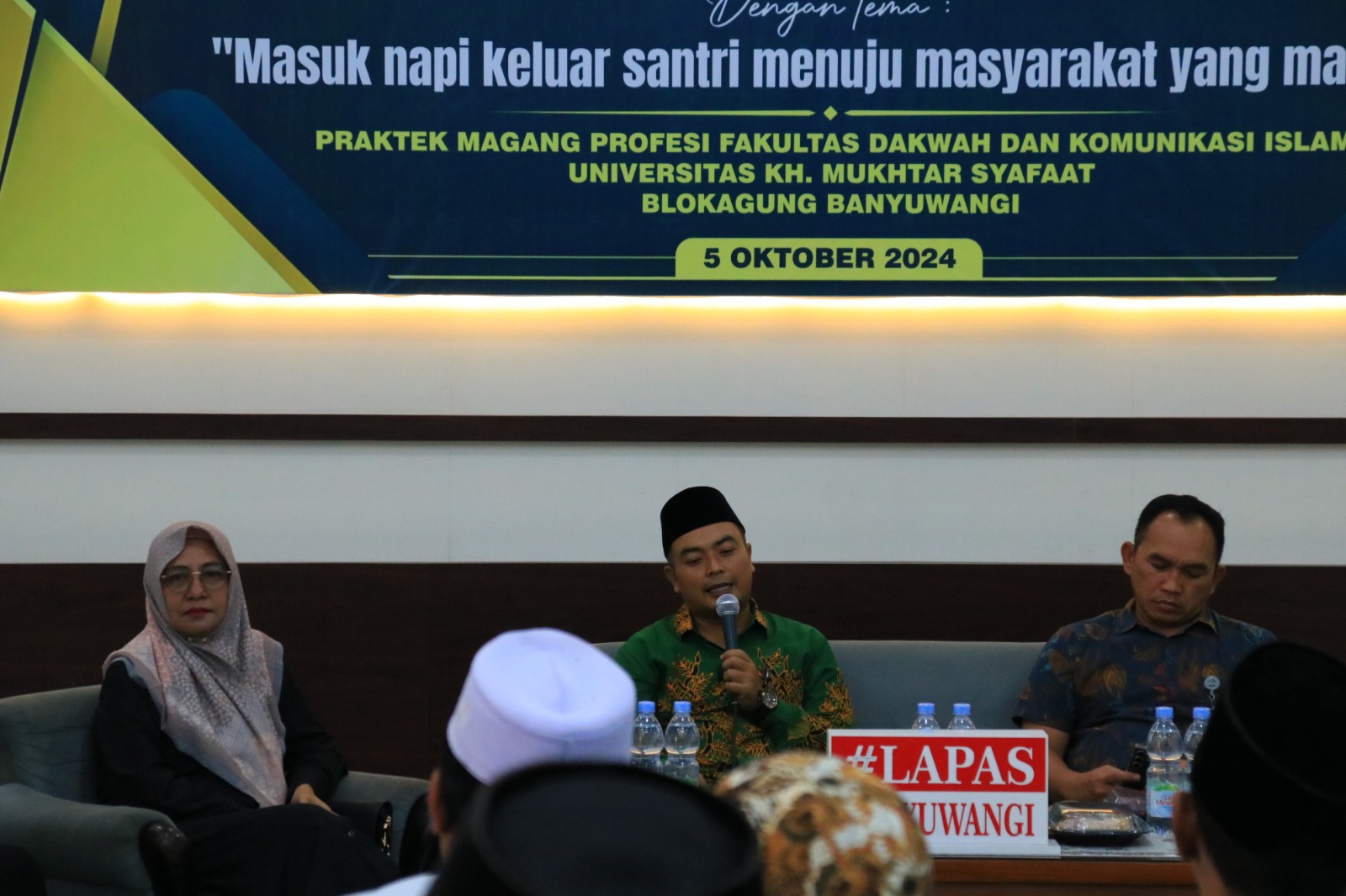 Kepala Lapas Kelas IIA Banyuwangi, Agus Wahono, bersama Kepala Subseksi Bimbingan Kemasyarakatan dan Perawatan, Dhanny Dwi Suswinarko, serta Wakil Rektor 1 UIMSYA Blokagung, Abdi Fauzi, dan Dosen Pembimbing Lapangan Fakultas Dakwah dan Komunikasi Islam, Nur Hofifah, turut hadir dalam acara tersebut.
