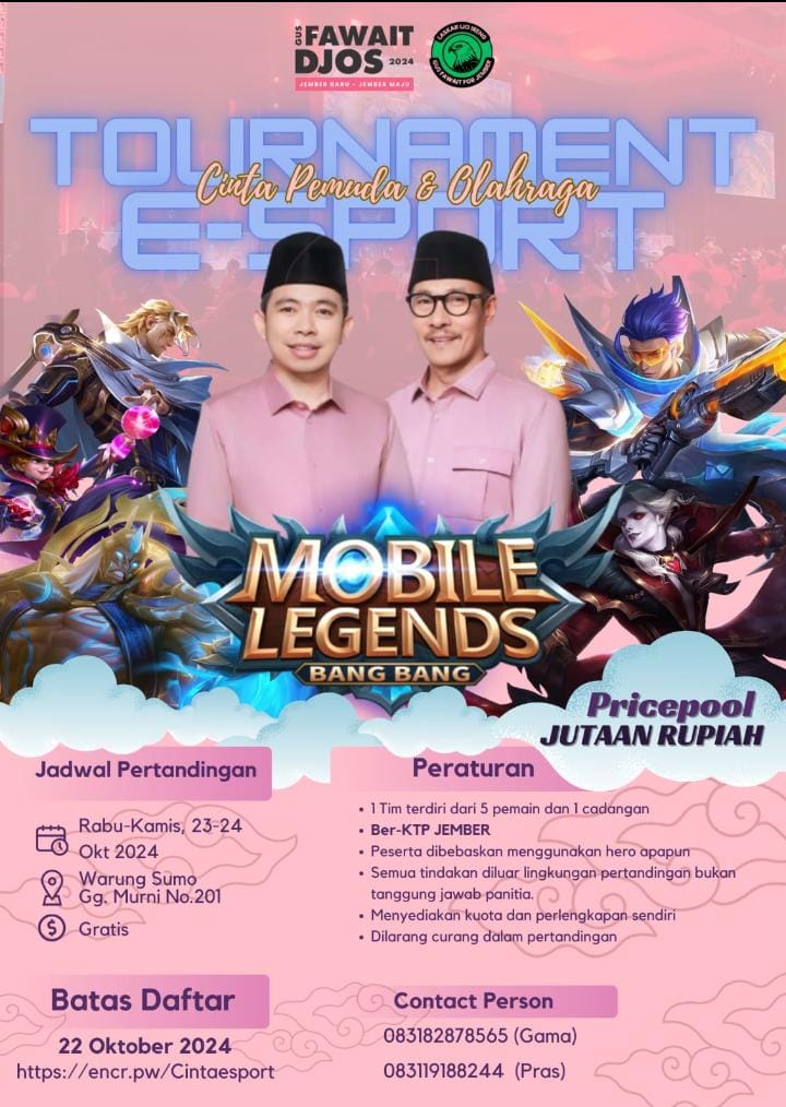 Jember, – Ratusan pelajar yang masuk kategori pemilih pemula meramaikan ajang kompetisi E-sport Mobile Legends yang digelar oleh Laskar Ijo Ireng, sebuah kelompok relawan pendukung pasangan Gus Fawait-Djoko Susanto. Perlombaan tersebut berlangsung selama dua hari, yaitu 23 hingga 24 Oktober 2024, di Warung Sumo, Gang Murni, Jalan Karimata, Kabupaten Jember.