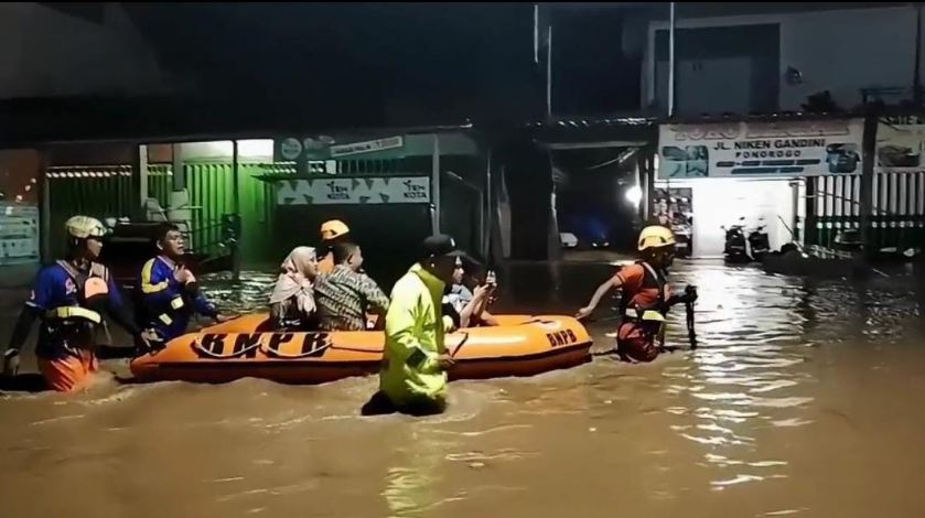 Melihat kondisi tersebut, Anggota Polres Ponorogo bersama Badan Penanggulangan Bencana Daerah (BPBD) dan warga setempat segera bergerak cepat melakukan evakuasi terhadap warga yang terdampak banjir.