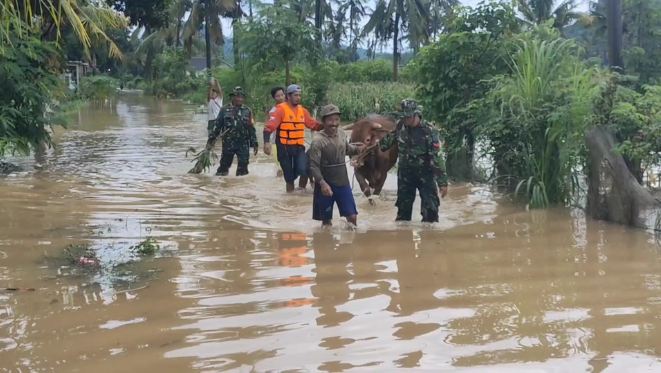 Petugas gabungan yang terdiri dari TNI, Polri, dan BPBD melakukan evakuasi terhadap warga, terutama lanjut usia (lansia), serta ternak milik warga yang terancam keselamatannya. “Sejumlah warga lansia telah dievakuasi sejak semalam menggunakan perahu, begitu juga ternak yang menyusul,” tambah Ofid.