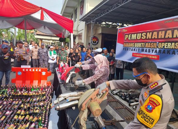 Sebanyak 6.429 botol miras berbagai merek atau setara dengan 4.042 liter dan 107 knalpot brong yang tidak sesuai spesifikasi pabrikan telah dimusnahkan. Pemusnahan barang bukti tersebut merupakan hasil dari Operasi Cipta Kondisi, Pekat, dan Kegiatan Rutin yang Ditingkatkan (KRYD) yang digelar mulai 9 hingga 19 Desember 2024.