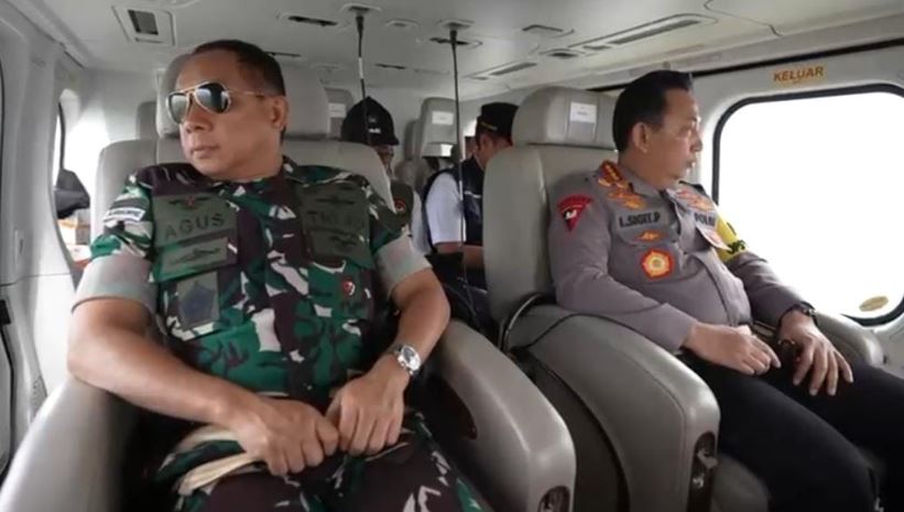 Kapolri dan Panglima TNI terlihat duduk berdampingan di helikopter saat memantau langsung kondisi arus mudik di Km 70 Tol Cikopo dan kembali ke Km 57 Jakarta-Cikampek. Pemantauan udara ini dilakukan untuk memberikan gambaran yang komprehensif mengenai situasi lalu lintas selama libur panjang.