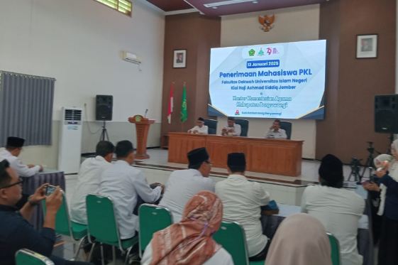BANYUWANGI – Aula bawah Kantor Kementerian Agama Kabupaten Banyuwangi menjadi tempat penerimaan mahasiswa Praktik Kerja Lapangan (PKL) Fakultas Dakwah Universitas Islam Negeri Kiai Haji Achmad Shiddiq (UINKHAS) Jember, pada Senin (13/01/2025). Acara ini menandai dimulainya kolaborasi antara UINKHAS Jember dan Kemenag Banyuwangi dalam memperkuat moderasi beragama di tengah masyarakat.