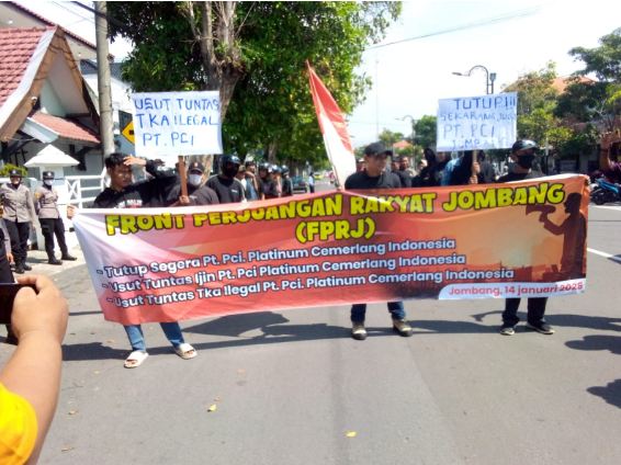JOMBANG – Ratusan massa yang tergabung dalam Front Perjuangan Rakyat Jombang (FPRJ) menggelar aksi unjuk rasa di depan kantor Pemerintah Kabupaten Jombang pada Senin pagi (14/1/2025). Dalam aksinya, mereka mendesak penutupan PT. PCI Platinum Cemerlang Indonesia dan menuntut pengusutan dugaan pelanggaran yang dilakukan perusahaan tersebut.