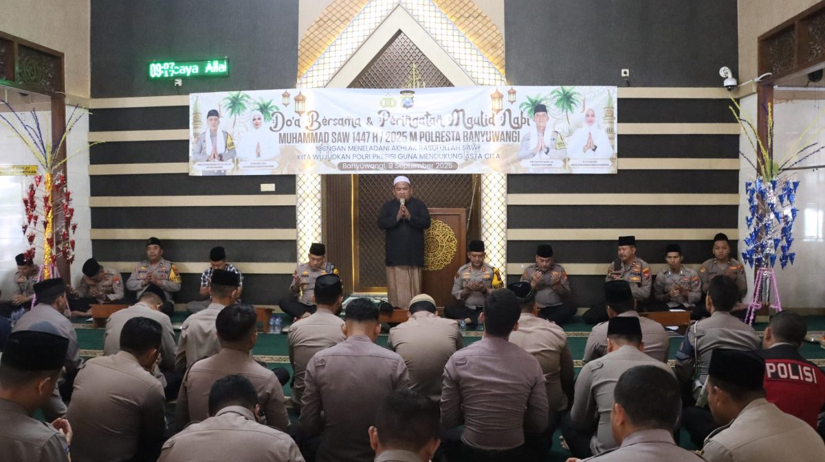 Banyuwangi – Peringatan Maulid Nabi Muhammad SAW 1447 H/2025 M di lingkungan Polresta Banyuwangi berlangsung penuh khidmat pada Senin (8/9/2025). Bertempat di Masjid Roudhotul Jannah, acara dihadiri jajaran kepolisian, Bhayangkari, serta keluarga besar Polresta.