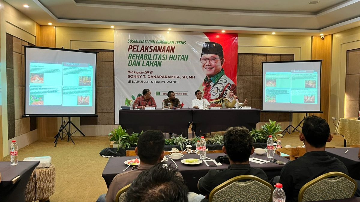 BANYUWANGI — Komitmen terhadap pelestarian lingkungan dan peningkatan kesejahteraan masyarakat kembali ditegaskan oleh Anggota Komisi IV DPR RI, Sonny T. Danaparamita, S.H., M.H. dalam kegiatan Sosialisasi dan Bimbingan Teknis (Bimtek) Pelaksanaan Rehabilitasi Hutan dan Lahan (RHL) yang digelar di Hotel Luminor Klatak Banyuwangi, Senin (6/10/2025).