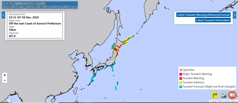 Peringatan tsunami dikeluarkan untuk wilayah Iwate, Aomori, dan Hokkaido, dengan potensi gelombang mencapai tiga meter. Meskipun gelombang awal yang terdeteksi hanya 80 cm, otoritas tetap menasihati kewaspadaan tinggi.