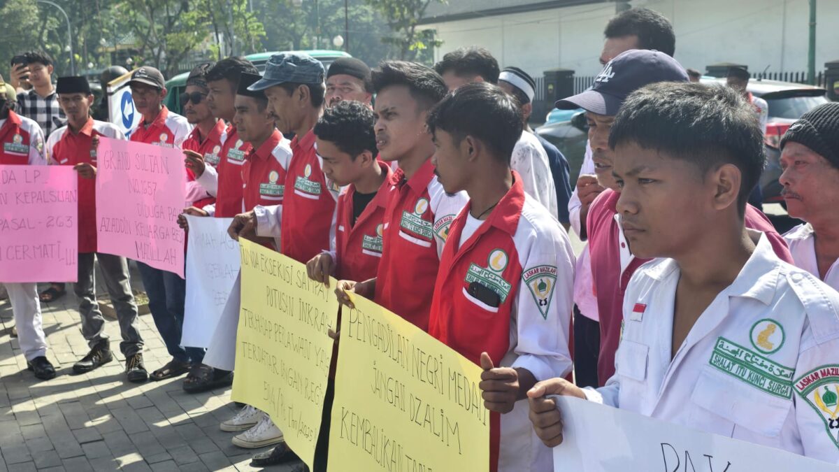 MEDAN — Ratusan massa dari Majelis Zikir As-Sholah (Mazilah) menggelar aksi damai di depan Pengadilan Negeri (PN) Medan, Senin (14/7/2025). Dalam aksinya, massa menuntut agar PN Medan menunda eksekusi atas lahan seluas 4,05 hektare milik Muhammad Nur Azaddin, yang terletak di Jalan Pancing I, Kelurahan Besar, Kecamatan Medan Labuhan.