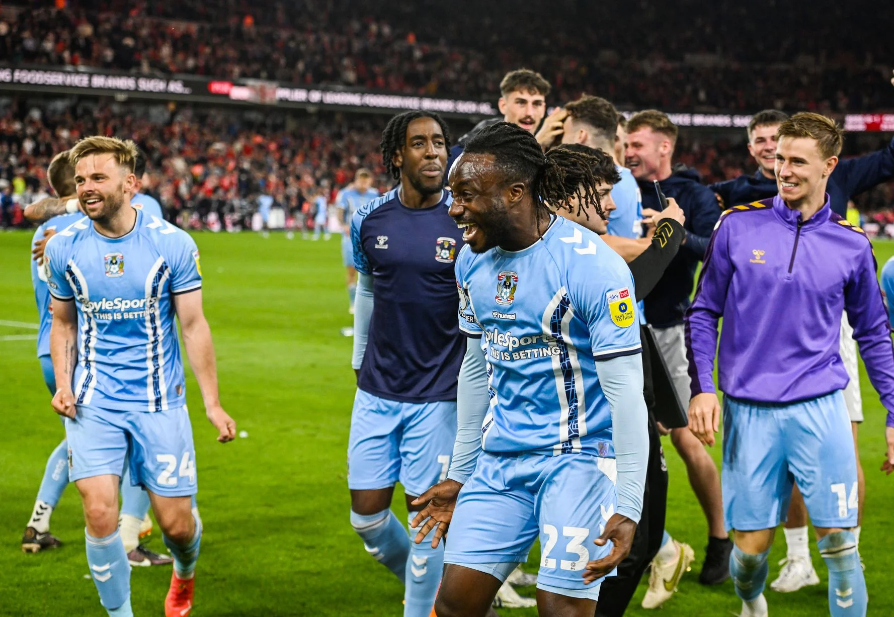 The Sky Blues’ supporters celebrated the promotion with fireworks and chants after the final whistle.