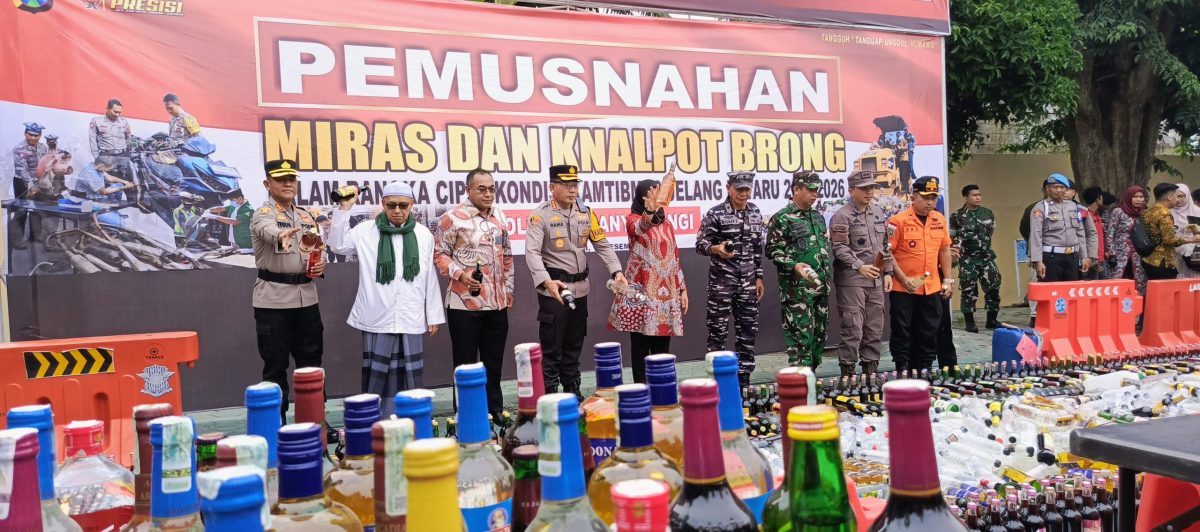 Banyuwangi. Polresta Banyuwangi memusnahkan ribuan botol minuman keras (miras) dan puluhan knalpot brong dalam rangka cipta kondisi keamanan dan ketertiban masyarakat (kamtibmas) menjelang Natal dan Tahun Baru (Nataru) 2025–2026. Kegiatan ini digelar di halaman Mapolresta Banyuwangi, Jumat (19/12/2025), usai apel gelar pasukan.